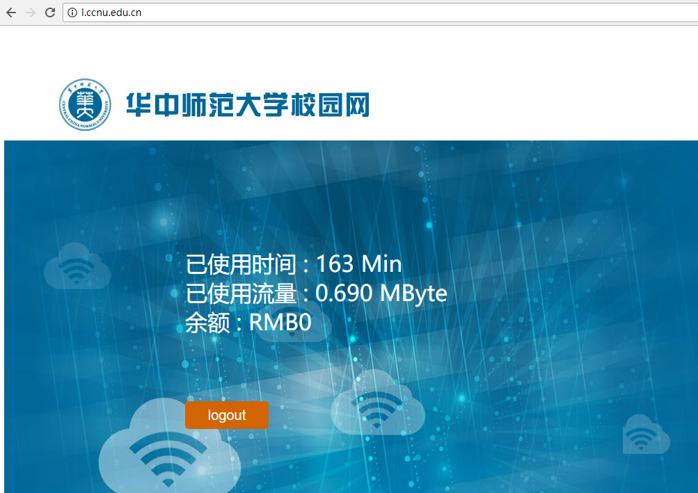 登录认证成功后即可正常上网如下图(图3)所示,会显示网络使用情况和注销退出功能。如不在使用网络,点击logout按钮注销。若图3所示的页面被关闭,可手动输入l.ccnu.edu.cn。